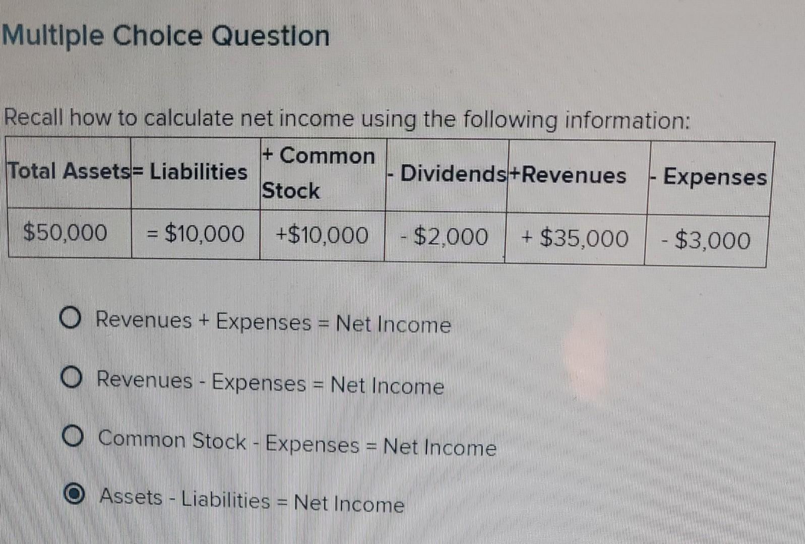 However from the balance sheet you can also calculate net income as total net worth plus cash dividends less issued stock. You usually calculate total net income as total revenues less total expenses. Common Total Assets Liabilities - DividendsRevenues Expenses Stock 50000 10000 10000 2000 HI 35000 - 3000 O Revenues Expenses Net Income O Revenues - Expenses Net Income O Common Stock.